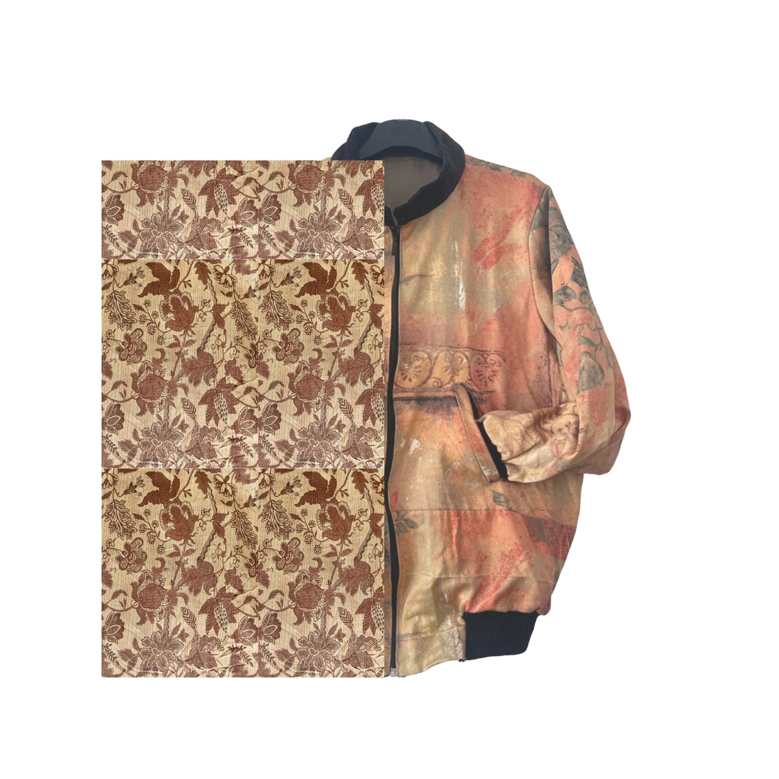 Ein Oversize-Bomber-Jacket in warmem Sand und tiefem Ocker, bedruckt mit einem dichten botanischen Muster — Vögel im Flug, verschlungen in Blättern, Granatäpfeln und kletternden Ranken. Das Gewebe ist schwer und charakterstark. Der Schnitt ist großzügig und gibt Raum zum Bewegen. Schwarzer Rippkragen, schwarze Rippbündchen, schwarzes Rippband unten. Reißverschluss mittig. Zwei Eingrifftaschen an der Hüfte.