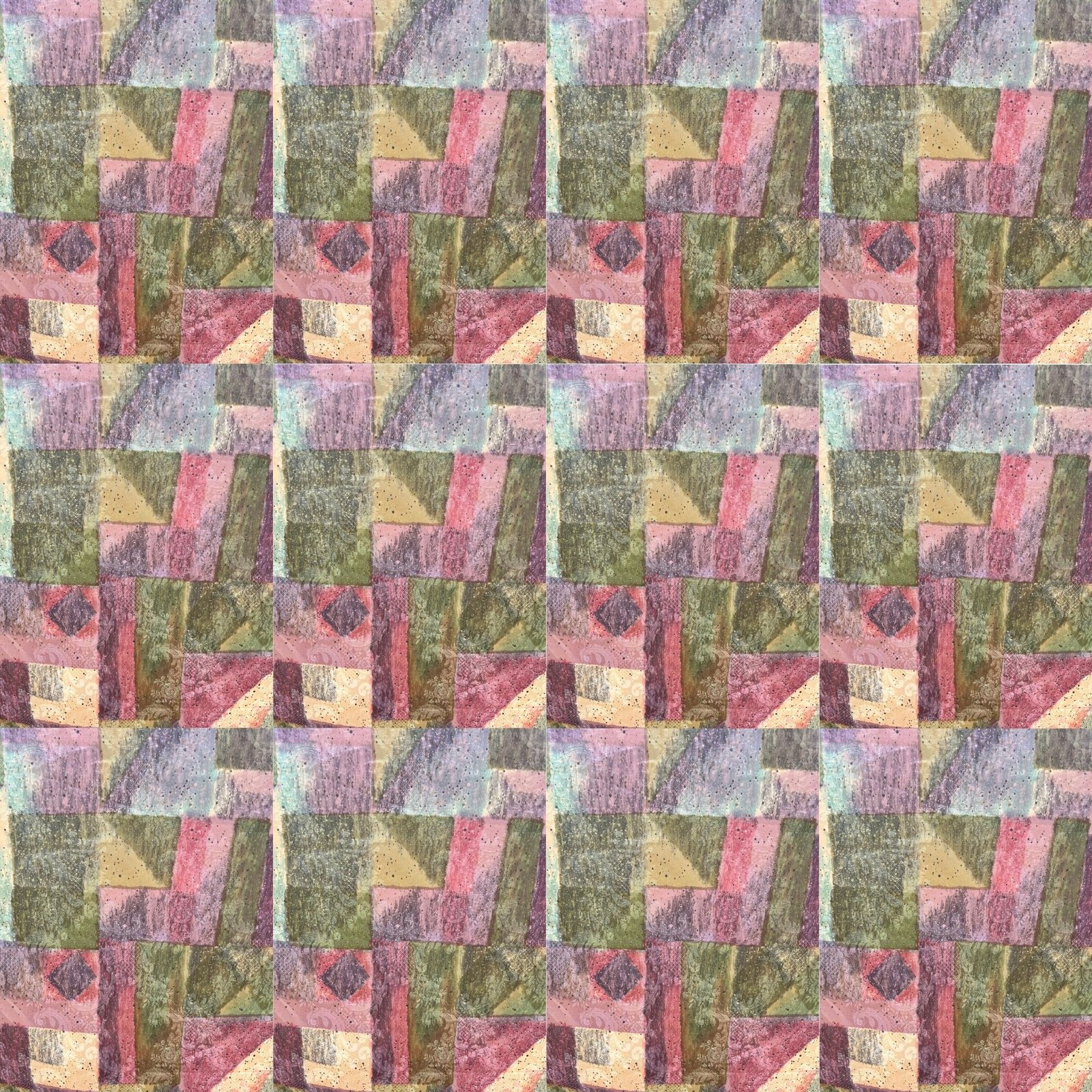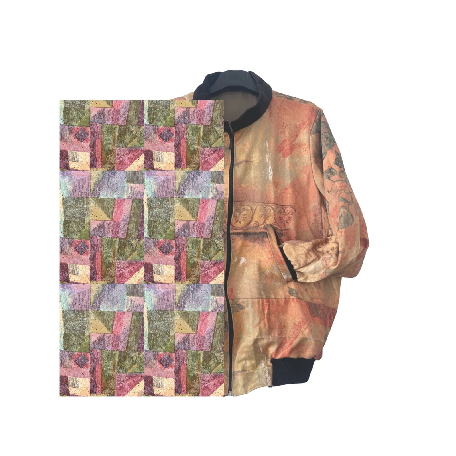 An oversized bomber in abstract patchwork — dusty rose, sage green, lilac and golden ochre. Looks like it was sewn from a hundred different fabrics. It wasn’t. It is one single piece of fabric, found at Kantamanto market in Accra. One. Only one.