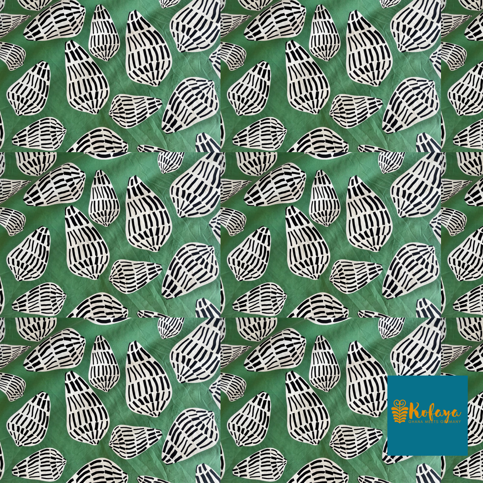 Full forest green. Bold black-and-white graphic print — abstract pods scattered across the surface like a statement being made. Loudly. Clearly. Without apology. Found at Kantamanto market in Accra. Sewn in Aburi, Ghana. Only one exists.