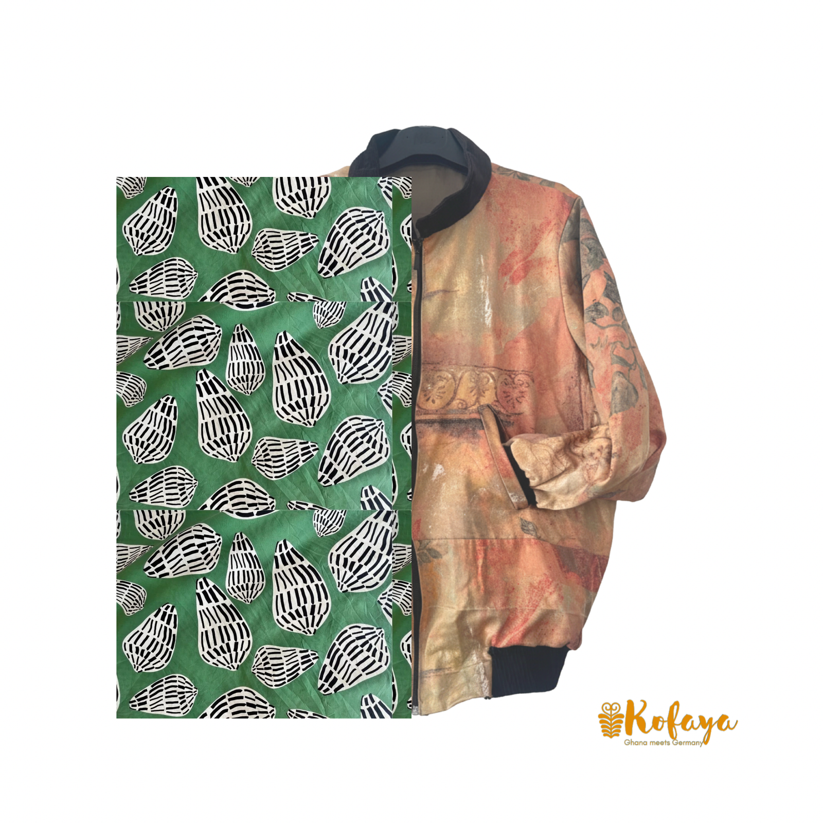 This fabric was at Kantamanto market in Accra, one of thousands of pieces that arrive weekly from European homes. Our tailors in Aburi, Ghana turned it into the jacket that declares itself from across the room.