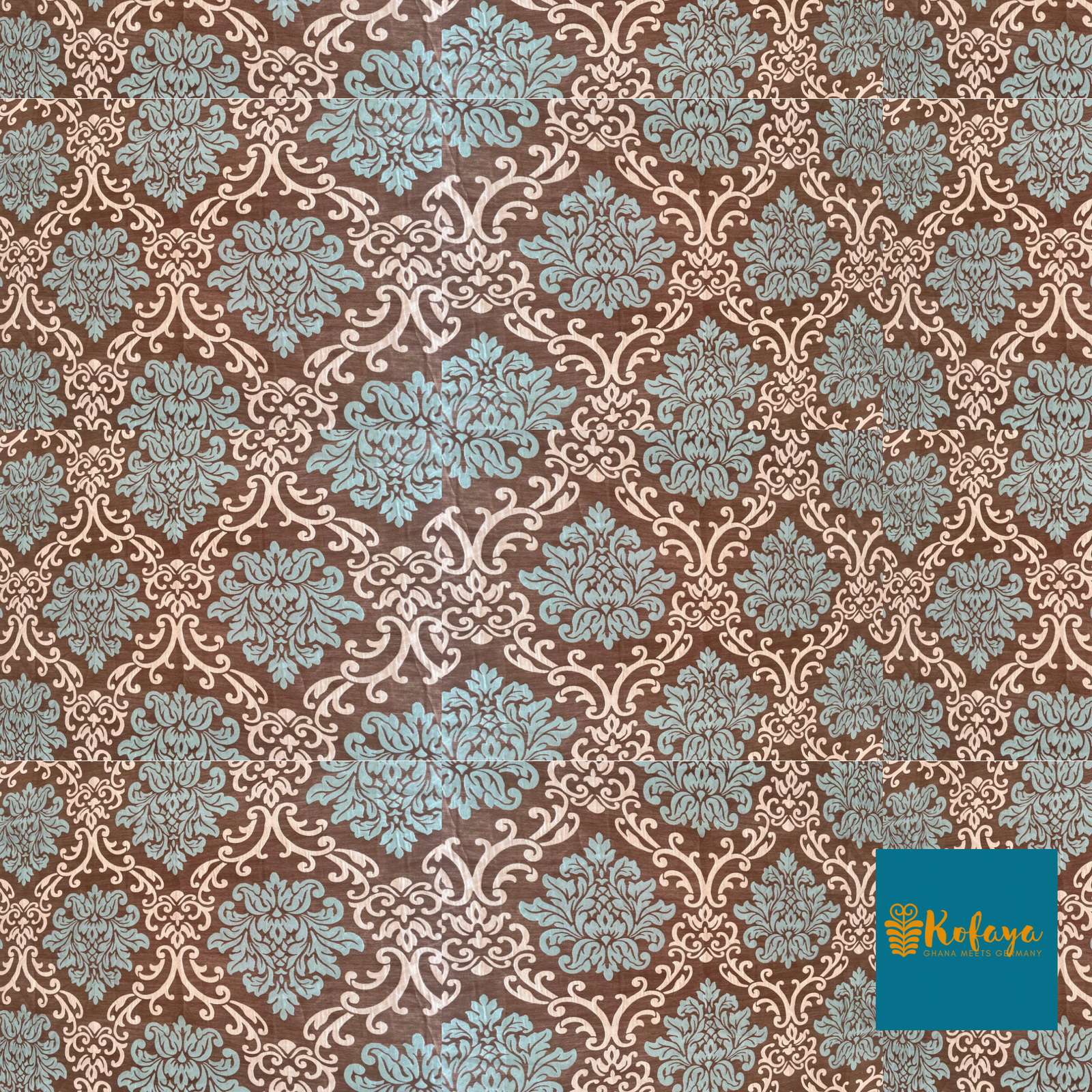SIKA ROSE is chocolate brown with teal-blue floral medallions and cream baroque scrollwork — a richly patterned damask that reads like an archive piece from a fashion house. It was a curtain at Kantamanto market in Accra. Our tailors in Aburi, Ghana saw what it could become.
