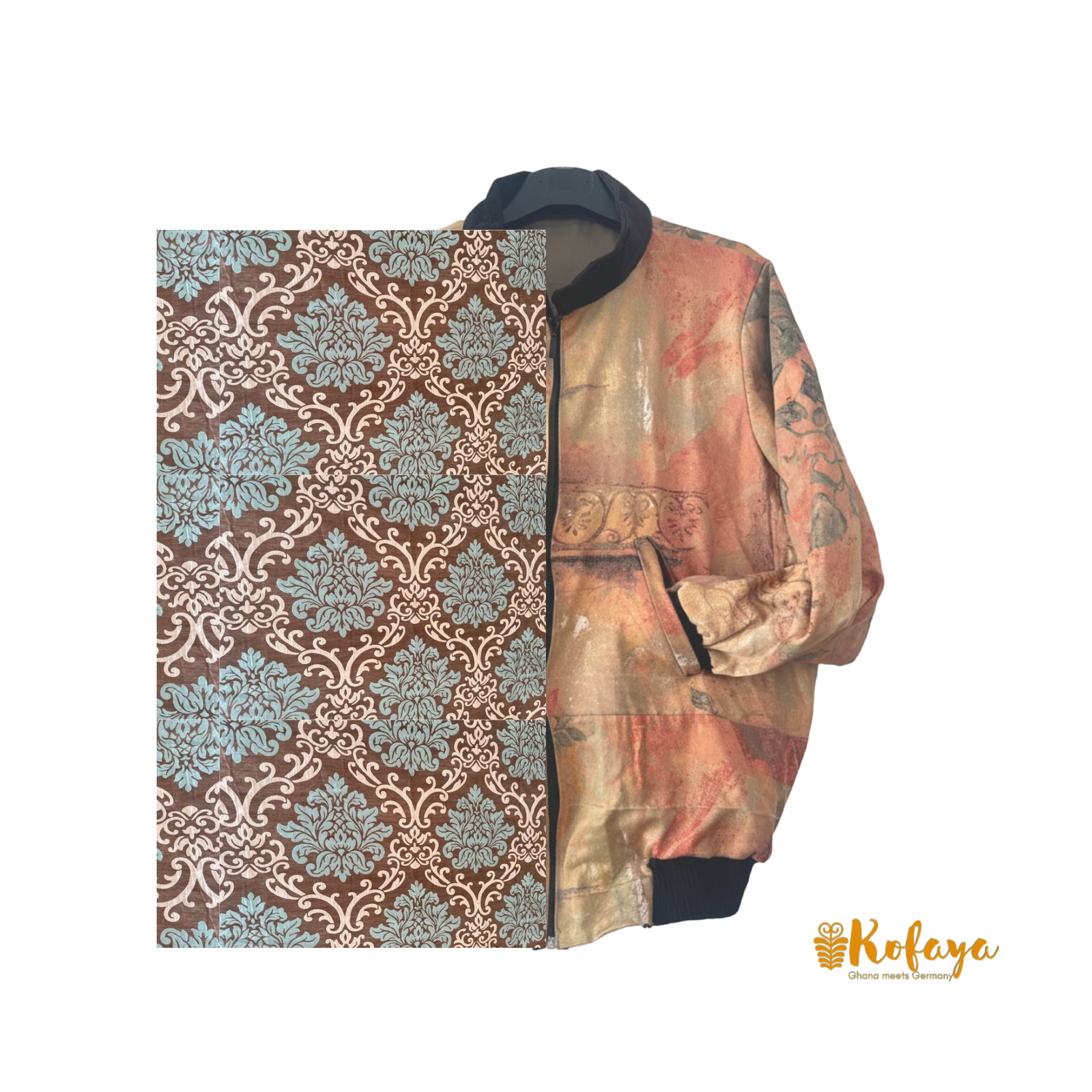 Sika means gold/moneyin Twi — not because this jacket is golden, but because Kofaya sees gold in what others throw away. Chocolate brown with teal-blue floral medallions and cream baroque scrollwork. Found at Kantamanto market in Accra. Sewn in Aburi, Ghana.